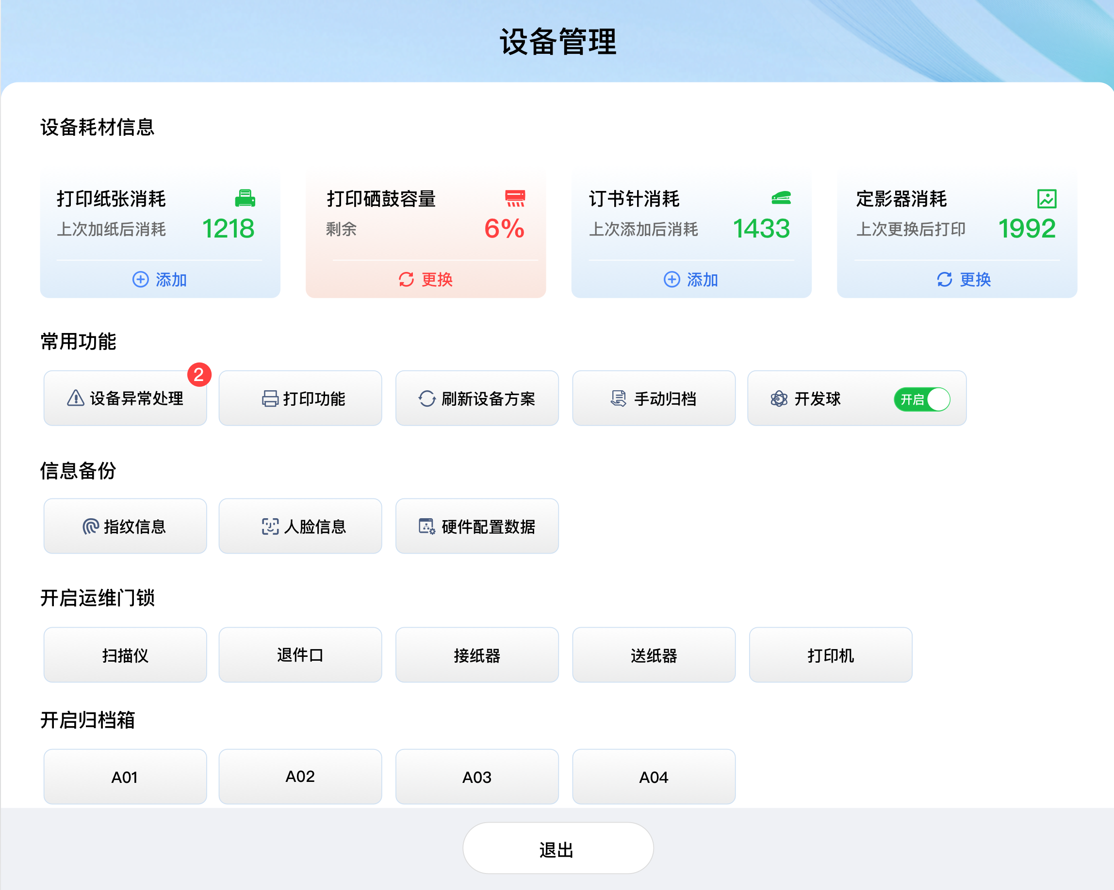 设备常用功能,包括设备异常处理及信息查看、打印测试功能、设备方案刷新、归档任务查询、开发球启用控制等;
