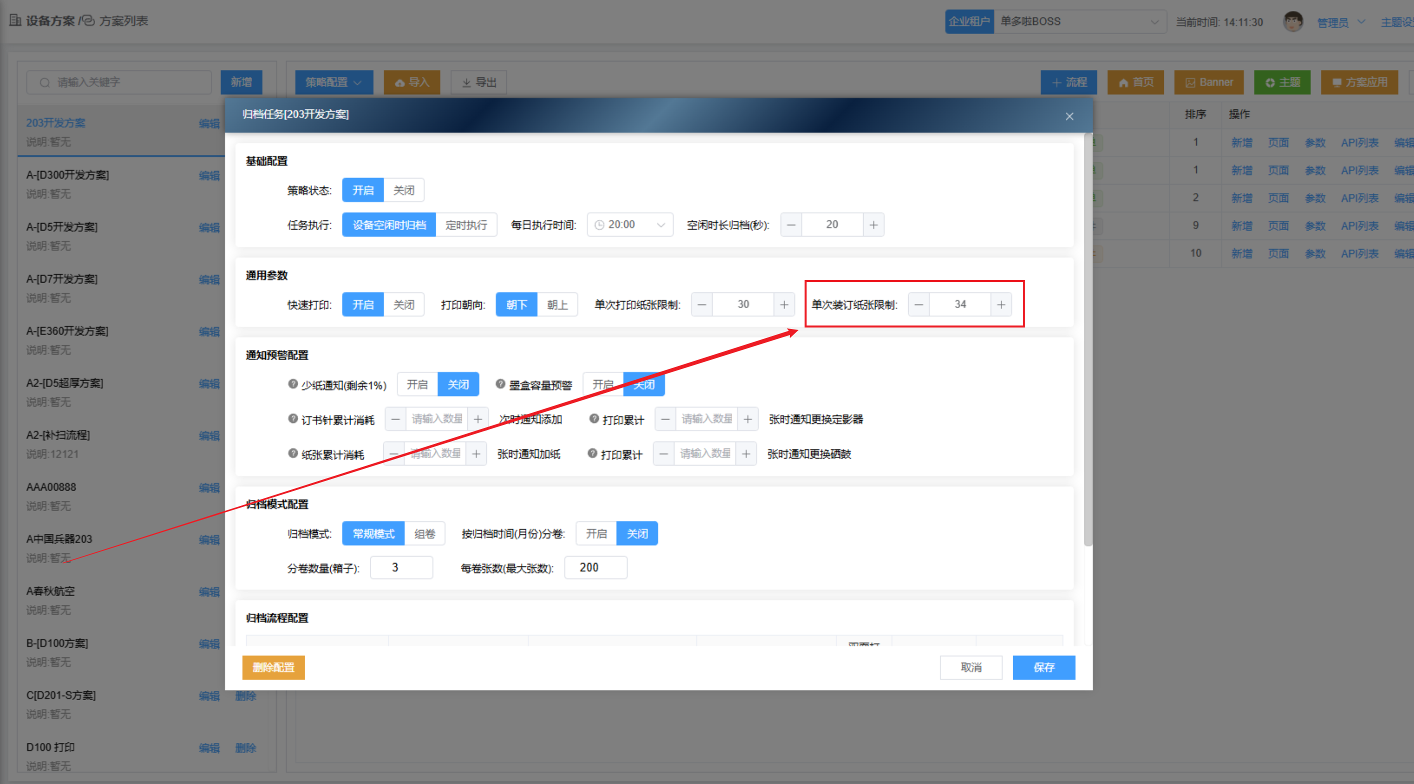 新增装订模块、装订纸张数量限制(例:40张),设备在执行归档装订时判断该单据总张数,纸张总数量≤40时执行装订后进归档箱,纸张总数量>40时,该单据不执行装订